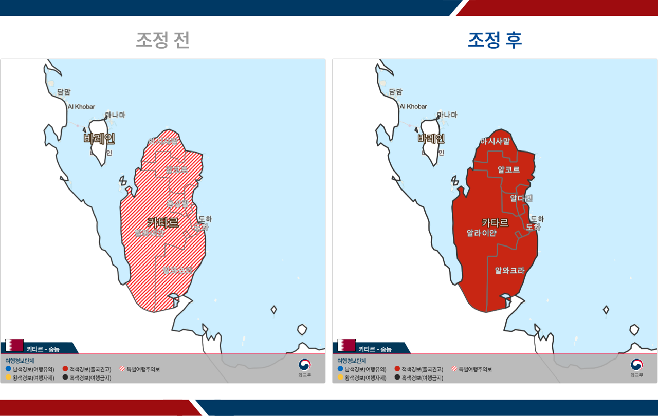 최근 중동 지역 정세가 지속 악화되어 우리 국민 안전에 대한 우려가 높아짐에 따라, 외교부는 카타르 현지시간 3.8(일) 13:00부로 바레인, 아랍에미리트, 오만, 카타르, 쿠웨이트, 사우디아라비아(일부지역), 요르단(일부지역)에 기존 발령된 특별여행주의보를 3단계 여행경보(철수 권고)로 상향 발령하였습니다.